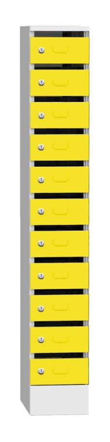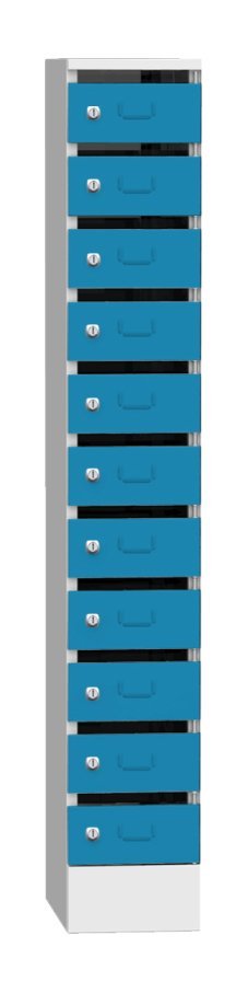 Szafka przeznaczona jest do sortowania poczty, dokumentów lub innych wartościowych przedmiotów. Oddzielnie zamykane skrzynki na cyl. zamknięcie na zamek lub kłódkę. Wysokość 1950 x szerokość 300 x głębokość 500 mm, 11 przegródek z narzutą. Kolor korpusu jasnoszary RAL 7035.