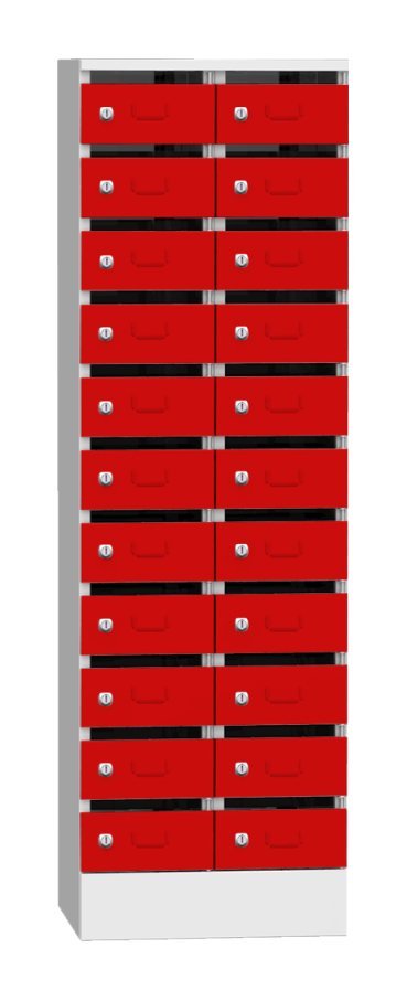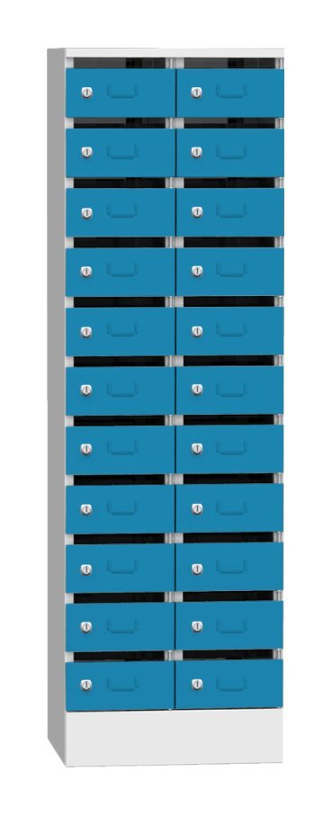 Szafka przeznaczona jest do sortowania poczty, dokumentów lub innych wartościowych przedmiotów. Oddzielnie zamykane skrzynki na cyl. zamknięcie na zamek lub kłódkę. Wysokość 1950 x szerokość 600 x głębokość 500 mm, 22 przegródki bez wrzutu. Kolor korpusu jasnoszary RAL 7035.