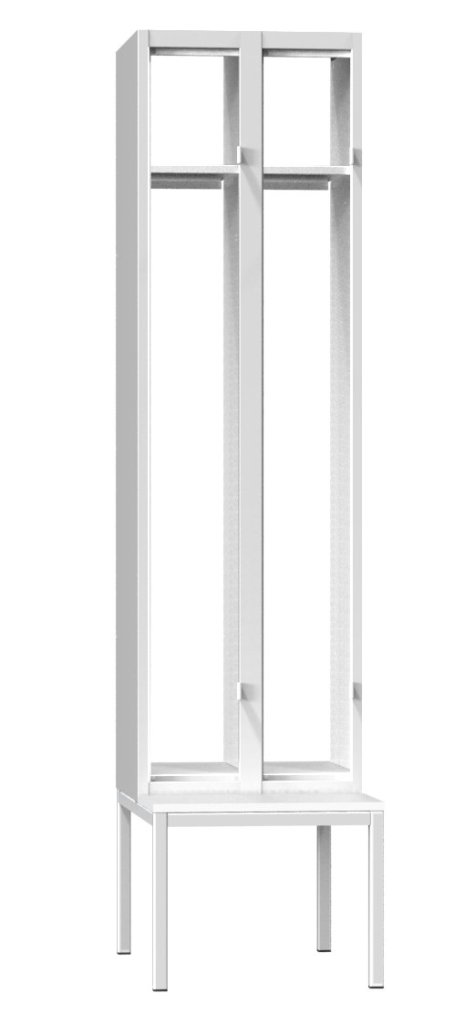 Szafa metalowa dwudrzwiowa z ławką, szerokość 500, 600 lub 800 mm, wysokość 2080 mm, głębokość 500 mm, w górnej części każdej półki półka oraz drążek z trzema plastikowymi haczykami. Cena bez etykiety na plakietkę z imieniem.