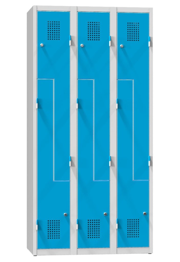 Szafa, drzwi dzielone w kształcie litery Z, wysokość 1850, szerokość 900, głębokość 500 mm. Ryglowanie za pomocą zamka bębenkowego lub zatyczki. Powierzchnia zabezpieczająca przed wyważeniem, kratki wentylacyjne, różne kombinacje kolorystyczne. Szerokość przejściowa komórki garderoby 250/115 mm. Cena bez etykiety na plakietkę z imieniem.
