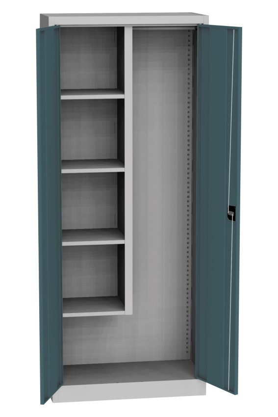 Szafa dwudrzwiowa z cokołem dzielonym (do czyszczenia), szerokość 950, wysokość 1950, głębokość 400 mm, 4 półki. Możliwość wymiany drzwi pełnych na drzwi z wypełnieniem szklanym, z wypełnieniem drucianym lub drzwi laminowane w odcieniu buku, brzozy lub wiśni. Kolor korpusu RAL 7035 jasnoszary.