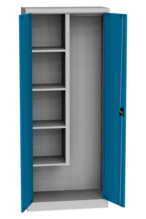 Szafa dwudrzwiowa z cokołem dzielonym, szerokość 800, wysokość 1950, głębokość 400 mm, 4 półki. Drzwi z wypełnieniem drucianym. Kolor korpusu RAL 7035 jasnoszary.