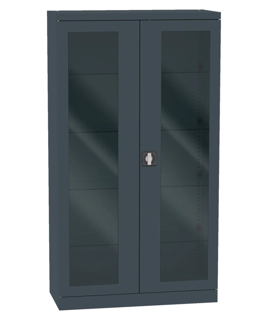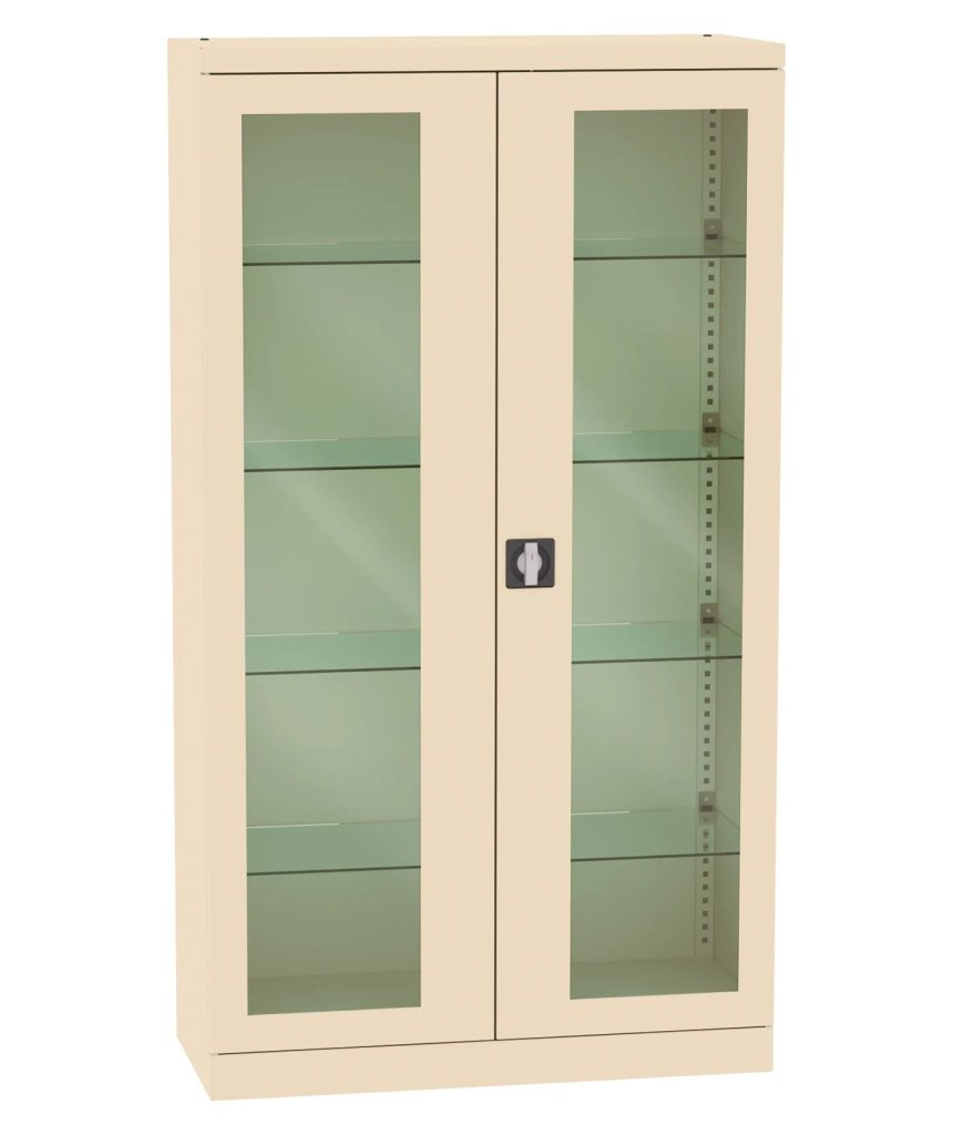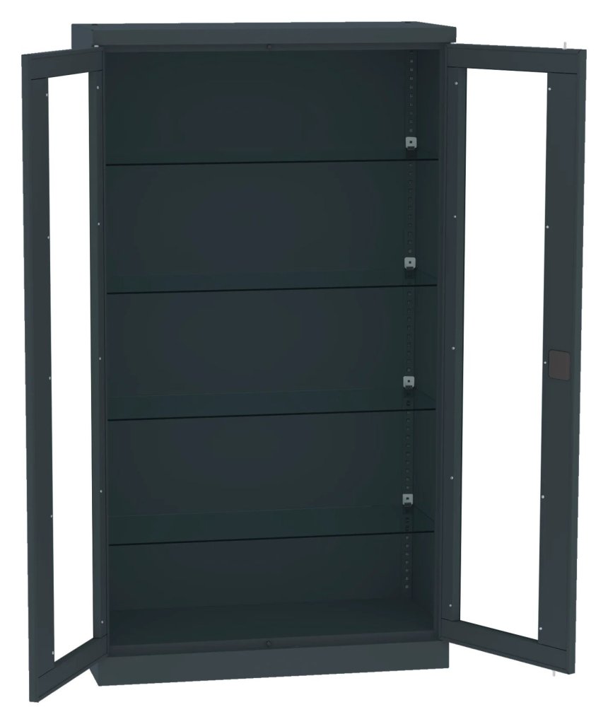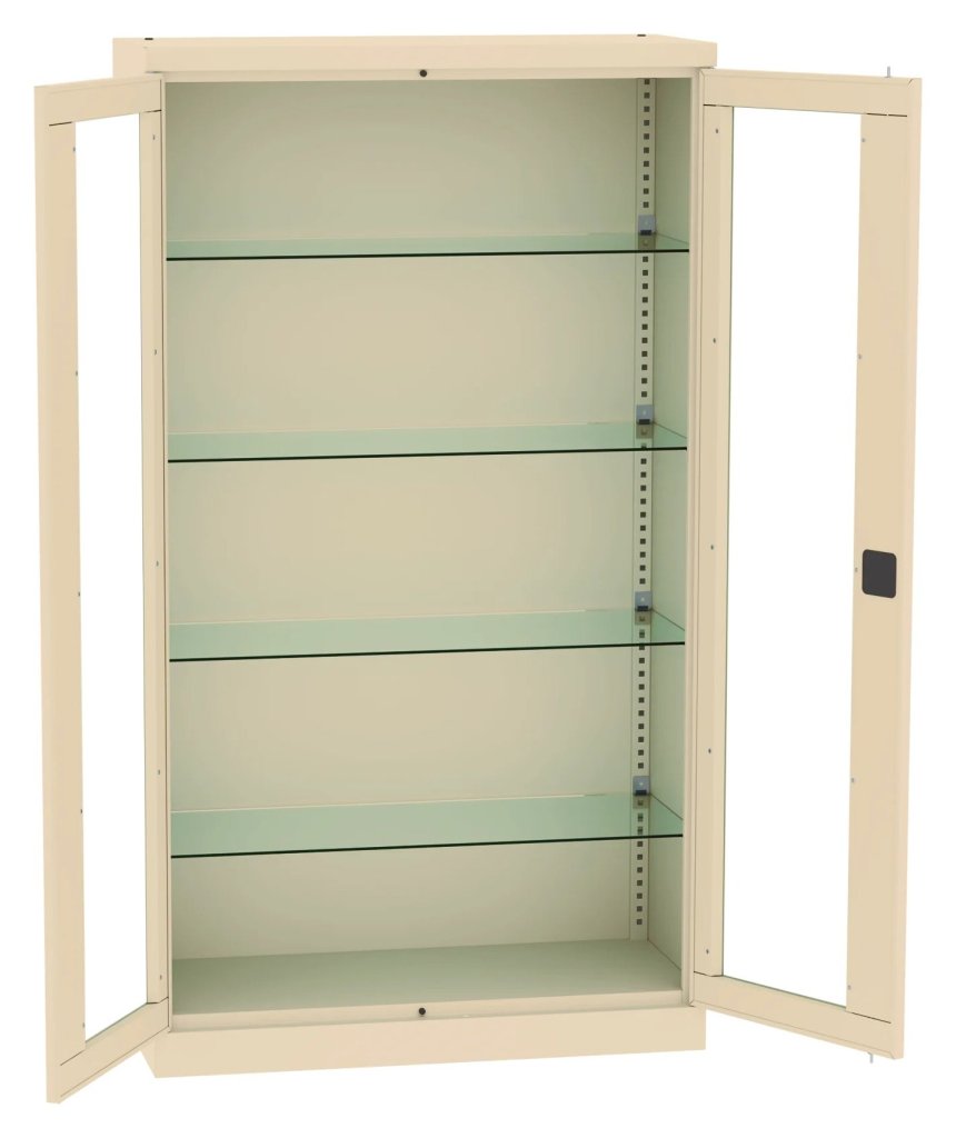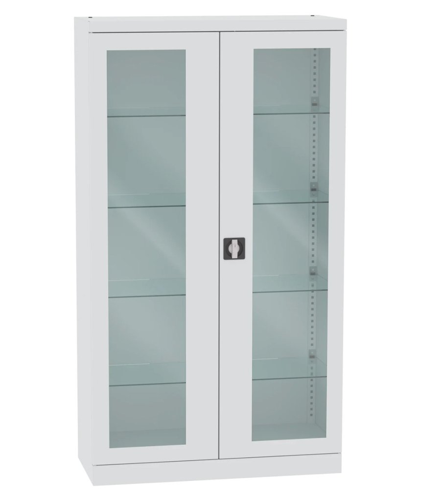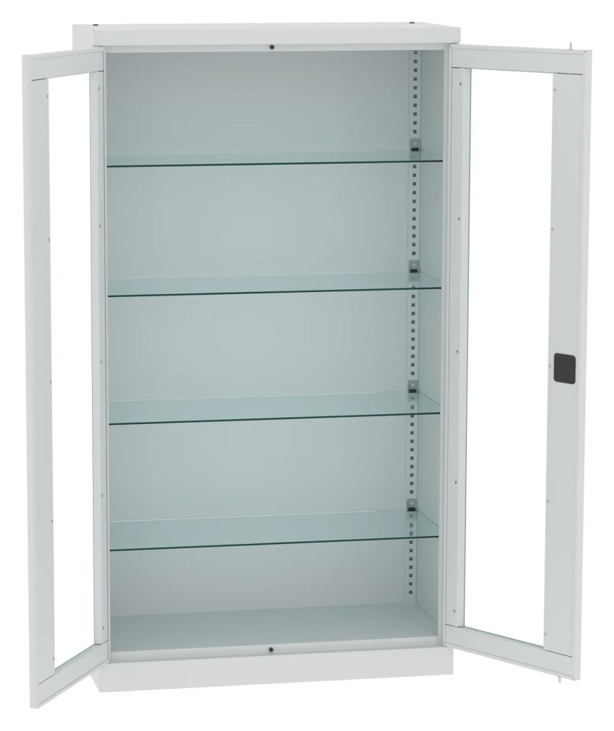 Szafa ze szklanymi drzwiami i półkami, wysokość 1800 x szerokość 800 x głębokość 435 mm. Zamek dwupunktowy. 4x regulowana półka szklana (nośność 25 kg) regulowana w odstępach co 25 mm. Szklane drzwi i szklane półki wykonane są ze szkła hartowanego.