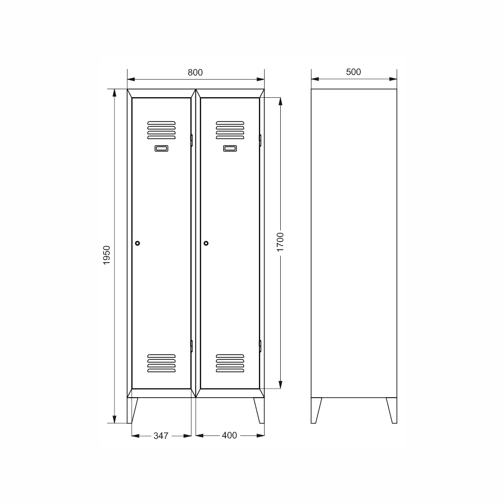 Szafa metalowa dwudrzwiowa na nogach, szerokość 800, wysokość 1950, głębokość 500 mm, zamek lub zamek. Kolor korpusu RAL 7035 jasnoszary.