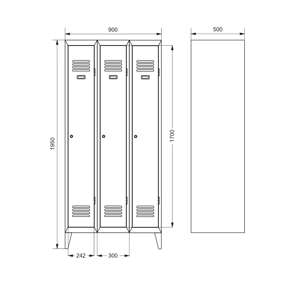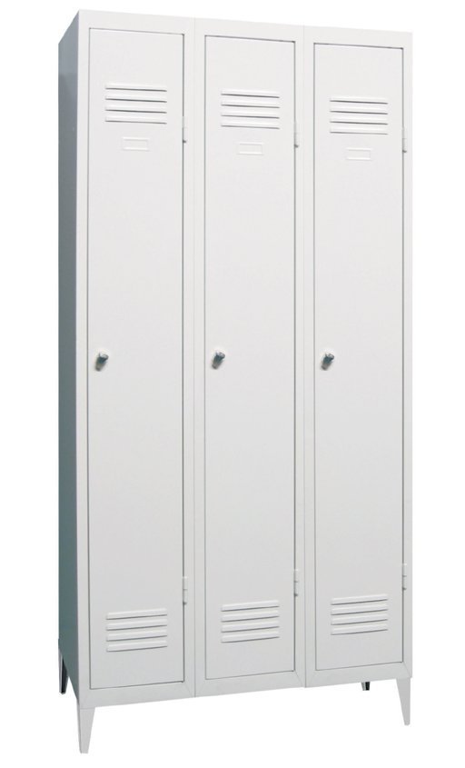 Szafa metalowa, trzydrzwiowa, na nogach, szerokość 900, wysokość 1950, głębokość 500 mm, zamek bębenkowy lub na kłódkę. Kolor korpusu RAL 7035 jasnoszary.