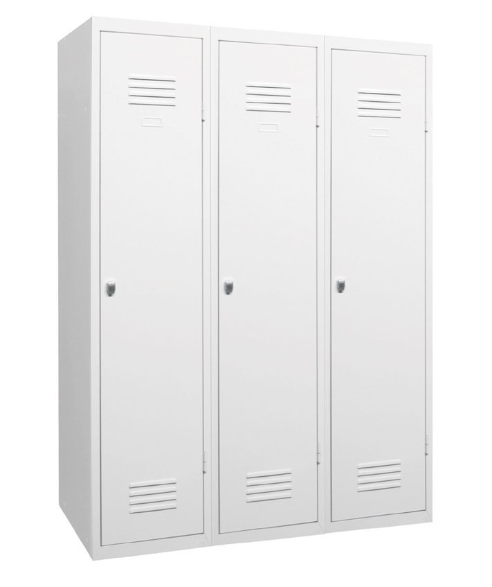 Szafa metalowa, trzydrzwiowa, na nogach, szerokość 900, wysokość 1950, głębokość 500 mm, zamek bębenkowy lub na kłódkę. Kolor korpusu RAL 7035 jasnoszary.
