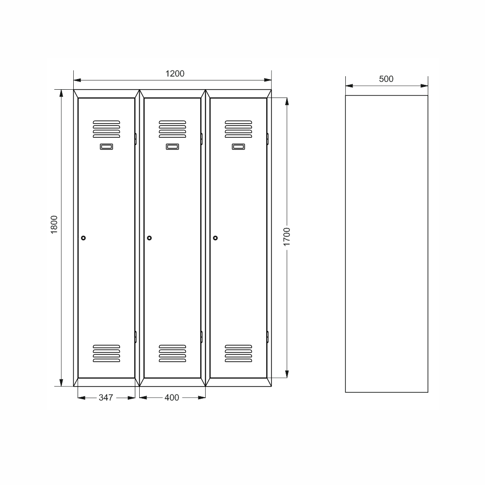 Szafa metalowa, trzydrzwiowa, na cokole. Szerokość 1200, wysokość 1800 i głębokość 500 mm. Zamykana na zamek patentowy lub kłódkę. Pionowa przegroda służąca do oddzielania odzieży czystej i brudnej. Kolor korpusu RAL 7035 jasnoszary.