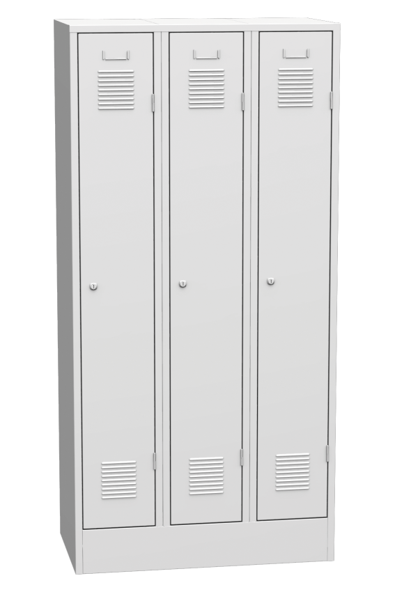 Szafka metalowa BHP trzydrzwiowa na średnim cokole, szerokość 900 mm x wysokość 1500 mm x głębokość 500 mm. Kolor korpusu RAL 7035 jasnoszary.