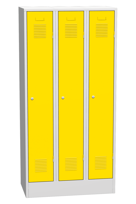 Szafa metalowa BHP trzydrzwiowa na cokole, szerokość 900, wysokość 1850, głębokość 500 mm, wewnętrzna przegroda do oddzielania odzieży czystej i brudnej. Drzwi standardowo wyposażone są we wzmocnienie zwiększające wytrzymałość, żaluzje wentylacyjne zapewniające przepływ powietrza oraz listwę z papierową tabliczką imienną. Zawiasy zewnętrzne, na życzenie Klienta istnieje możliwość przerobienia na zawiasy wewnętrzne. Za dopłatą można również wyposażyć drzwi w inny rodzaj otworów wentylacyjnych. Aby zwiększyć bezpieczeństwo, należy rozciągnąć wzmocnienie na całej długości drzwi lub wymienić standardowe na model dwuwarstwowy. Kolor korpusu RAL 7035 jasnoszary.