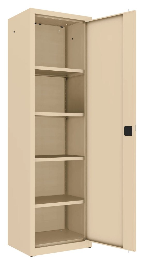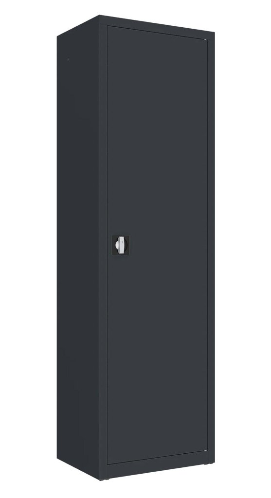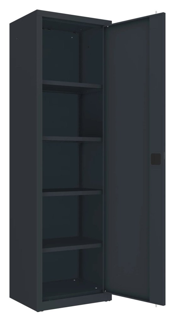 Jednodrzwiowa metalowa szafa biurowa z jedną półką, nadająca się jako nadstawka. Szerokość 600 mm, wysokość 810, głębokość 435 mm. Dwupunktowa blokada rozstawu osi, różne kolory.