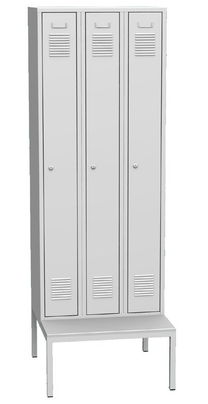 Szafa metalowa trzydrzwiowa z ławką, szerokość 750, wysokość 2085, głębokość 810 mm. Kolor korpusu RAL 7035 jasnoszary. pełny opis i parametry