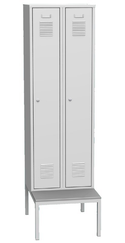 Szafa metalowa dwudrzwiowa z ławką, szerokość 600, wysokość 2085, głębokość 810 mm. Kolor korpusu RAL 7035 jasnoszary.