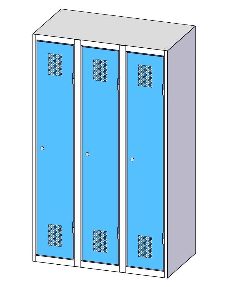 Szafa metalowa trzydrzwiowa szerokość 750 mm, wysokość 1500 mm, głębokość 500 mm, w górnej części każdej komory drążek z trzema plastikowymi haczykami, w dolnej części półki. Cena bez etykiety na plakietkę z imieniem.