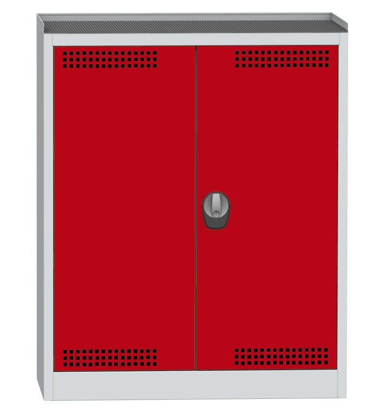 Szafa na chemikalia z tacami do gromadzenia płynów. Szafka wyposażona jest w 2 regulowane półki w kształcie tacy z solidną perforowaną, ocynkowaną kratą oraz jedną głębszą półkę w dolnej części szafy bez kratki. Wysokość 1180 x szerokość 950 x głębokość 500 mm, nośność półki 60 kg, nośność korpusu 300 kg, drzwiczki z wypełnieniem drucianym. Kolor korpusu RAL 7035 jasnoszary.