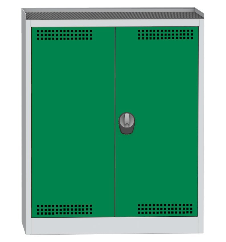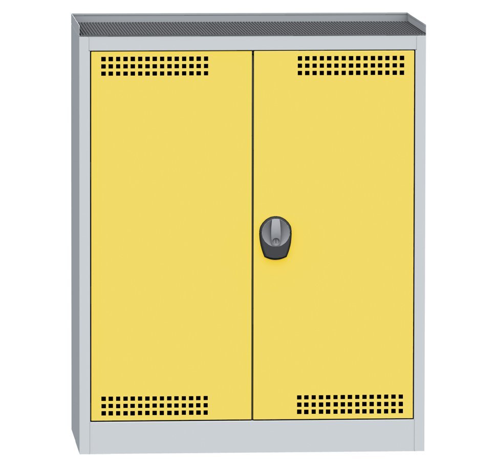 Szafa na chemikalia z tacami do gromadzenia płynów. Szafka wyposażona jest w 2 regulowane półki w kształcie tacy z solidną perforowaną, ocynkowaną kratą oraz jedną głębszą półkę w dolnej części szafy bez kratki. Wysokość 1180 x szerokość 505 x głębokość 500 mm, nośność półki 60 kg, nośność korpusu 300 kg. Drzwi druciane w ramie stalowej. Kolor korpusu RAL 7035 jasnoszary.