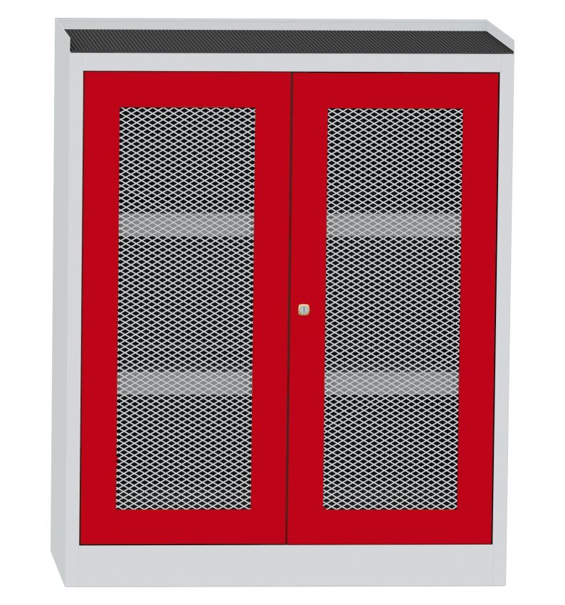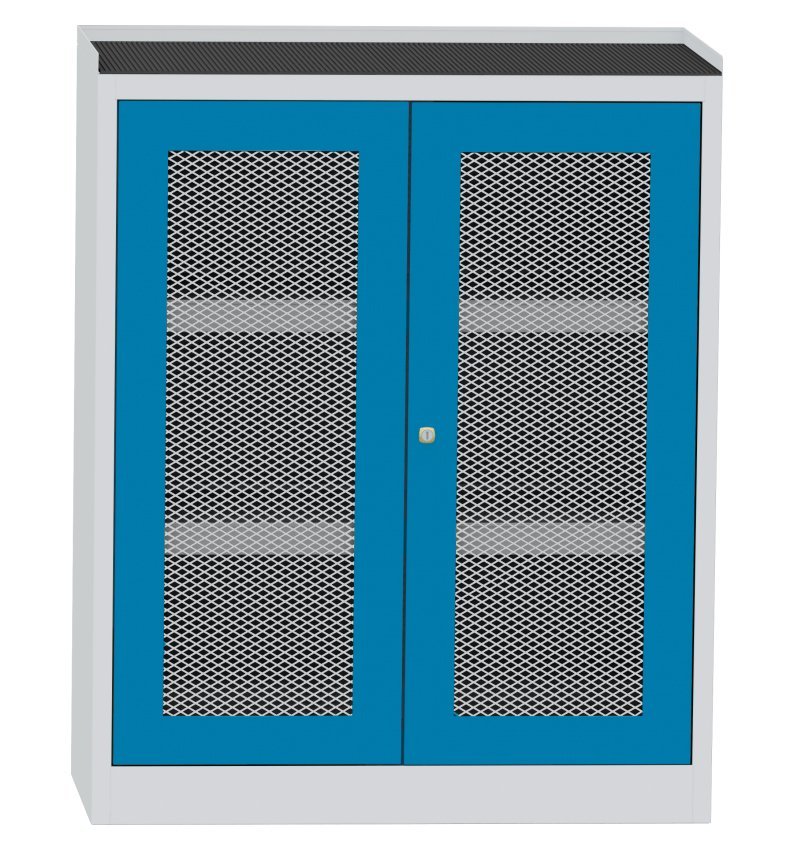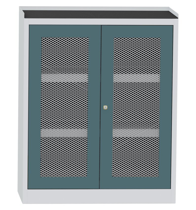 Szafa na chemikalia z tacami do gromadzenia płynów. Szafka wyposażona jest w 4 regulowane półki w kształcie tacy z solidną perforowaną kratą ocynkowaną oraz jedną głębszą półkę na dole szafy bez kratki. Wysokość 1950 x szerokość 950 x głębokość 500 mm, nośność półki 60 kg, nośność korpusu 300 kg. Drzwi druciane w ramie stalowej. Kolor korpusu RAL 7035 jasnoszary.
