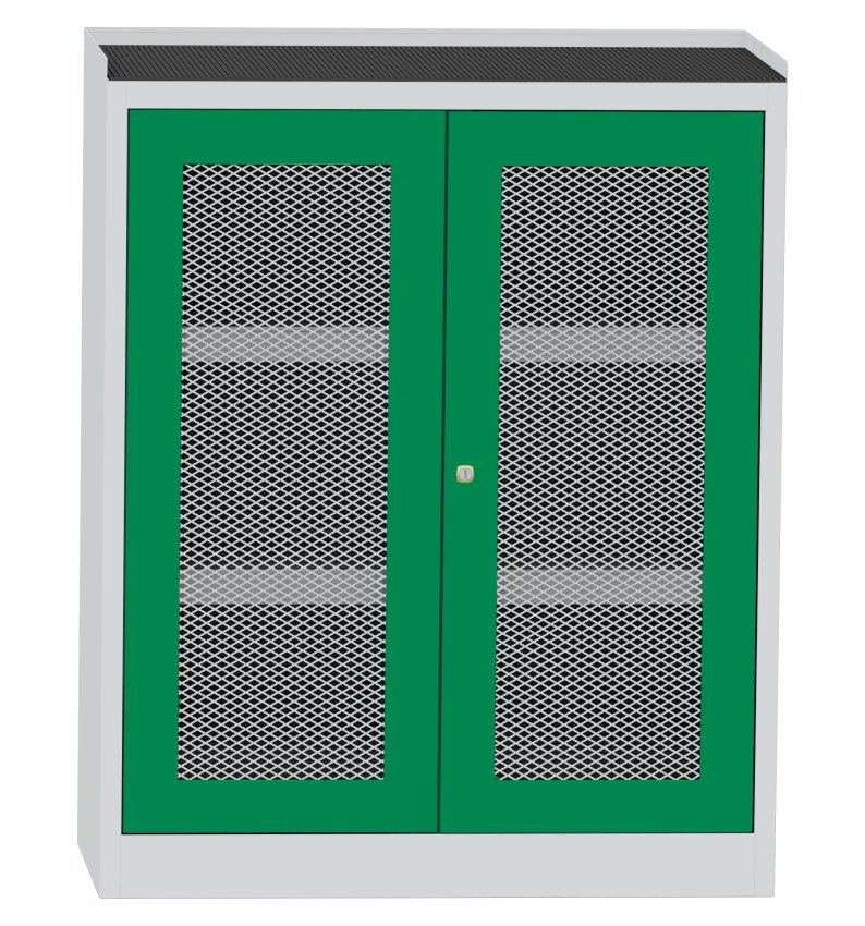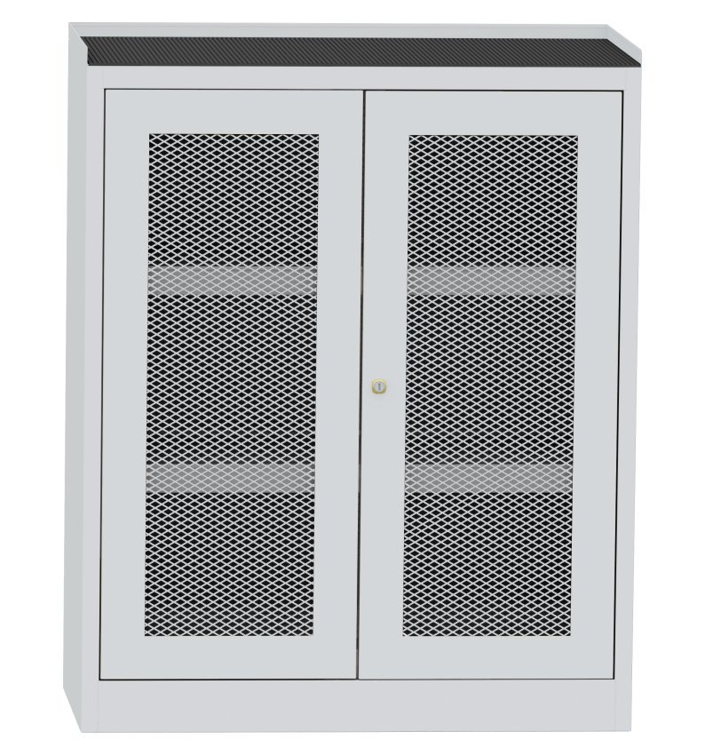 Szafa na chemikalia z tacami do gromadzenia płynów. Szafka wyposażona jest w 2 regulowane półki w kształcie tacy z solidną perforowaną, ocynkowaną kratą oraz jedną głębszą półkę w dolnej części szafy bez kratki. Wysokość 1180 x szerokość 505 x głębokość 500 mm, nośność półki 60 kg, nośność korpusu 300 kg. Drzwi druciane w ramie stalowej. Kolor korpusu RAL 7035 jasnoszary.