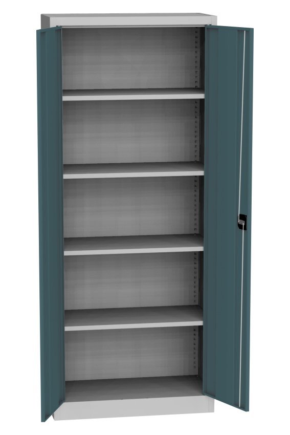 Szafa dwudrzwiowa z cokołem dzielonym (do czyszczenia), szerokość 950, wysokość 1950, głębokość 400 mm, 4 półki. Możliwość wymiany drzwi pełnych na drzwi z wypełnieniem szklanym, z wypełnieniem drucianym lub drzwi laminowane w odcieniu buku, brzozy lub wiśni. Kolor korpusu RAL 7035 jasnoszary.