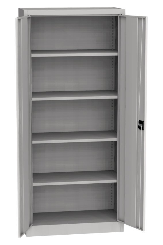 Szafa dwudrzwiowa z cokołem, szerokość 800, wysokość 1800, głębokość 400 mm, 4 półki. Możliwość wymiany drzwi pełnych na drzwi z wypełnieniem szklanym, z wypełnieniem drucianym lub drzwi laminowane w odcieniu buku, brzozy lub wiśni. Kolor korpusu RAL 7035 jasnoszary.