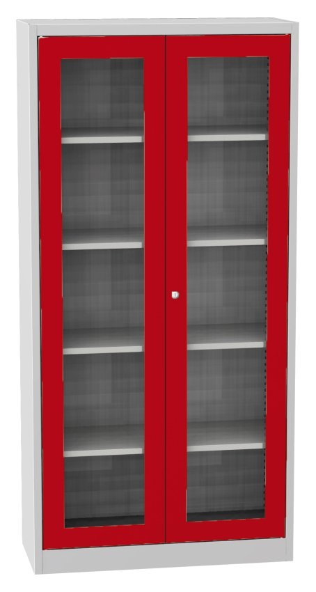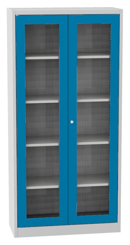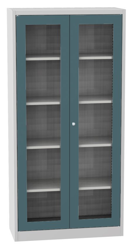 Szafa na dokumenty dwudrzwiowa z cokołem, szerokość 800, wysokość 1950, głębokość 400 mm, 4 półki. Drzwi z wypełnieniem szklanym. Kolor korpusu RAL 7035 jasnoszary.