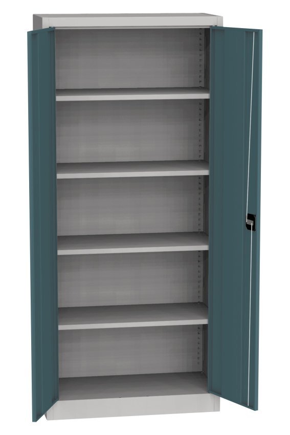 Szafa dwudrzwiowa z cokołem dzielonym (do czyszczenia), szerokość 950, wysokość 1950, głębokość 400 mm, 4 półki. Możliwość wymiany drzwi pełnych na drzwi z wypełnieniem szklanym, z wypełnieniem drucianym lub drzwi laminowane w odcieniu buku, brzozy lub wiśni. Kolor korpusu RAL 7035 jasnoszary.