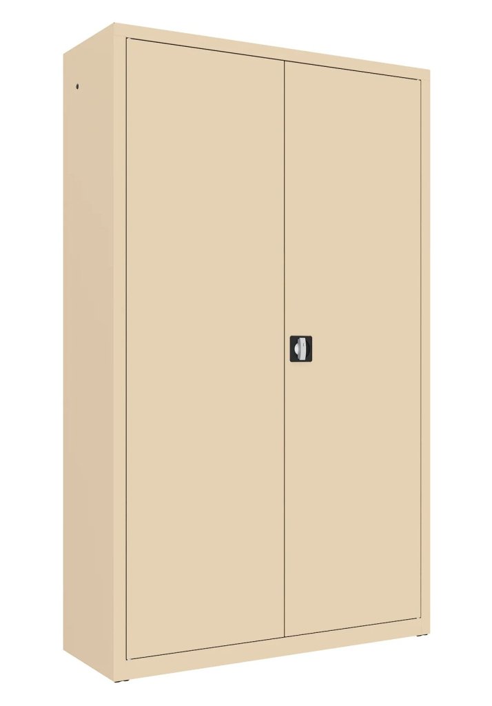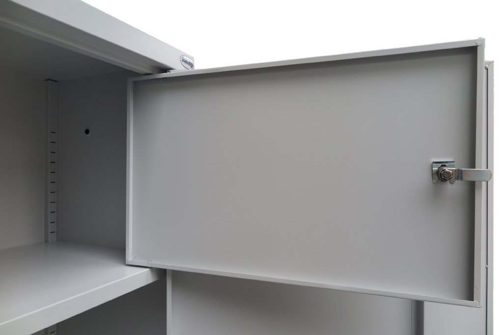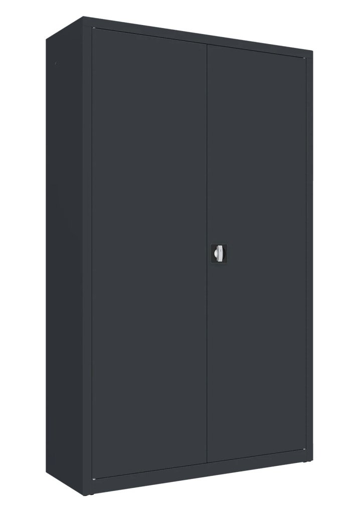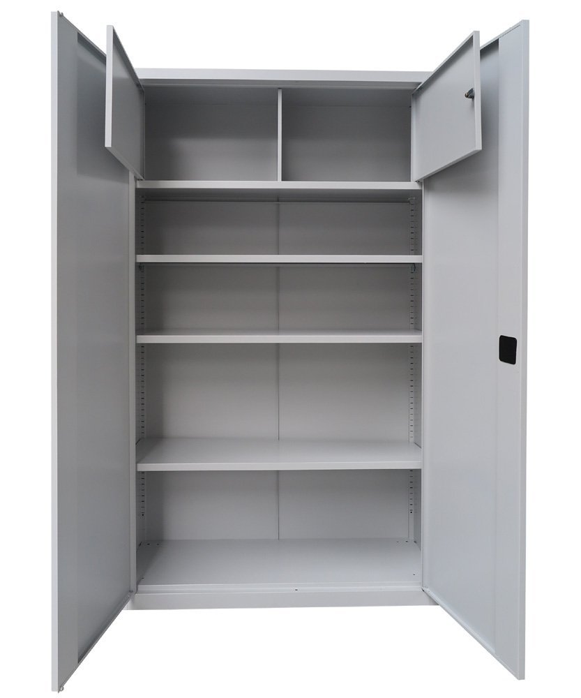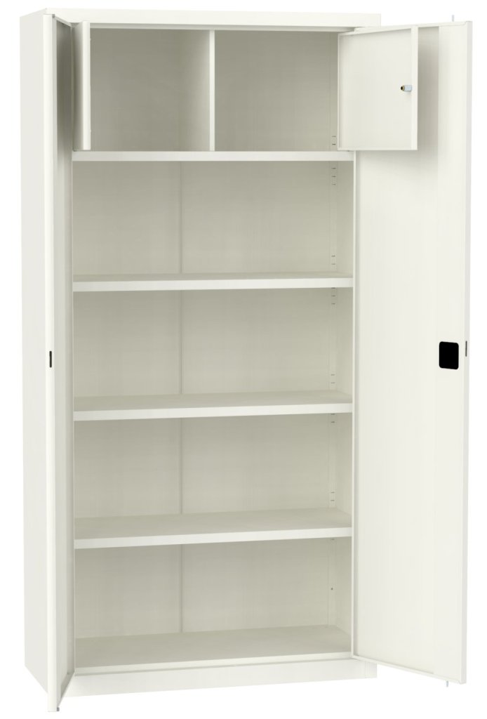 Dwudrzwiowa szafka metalowa na dokumenty z jedną półką, nadająca się jako nadstawka. Szerokość 600 / 800 / 1000 / 1200 mm (patrz warianty produktu), wysokość 810, głębokość 435 mm. Dwupunktowa blokada rozstawu osi, różne kolory.