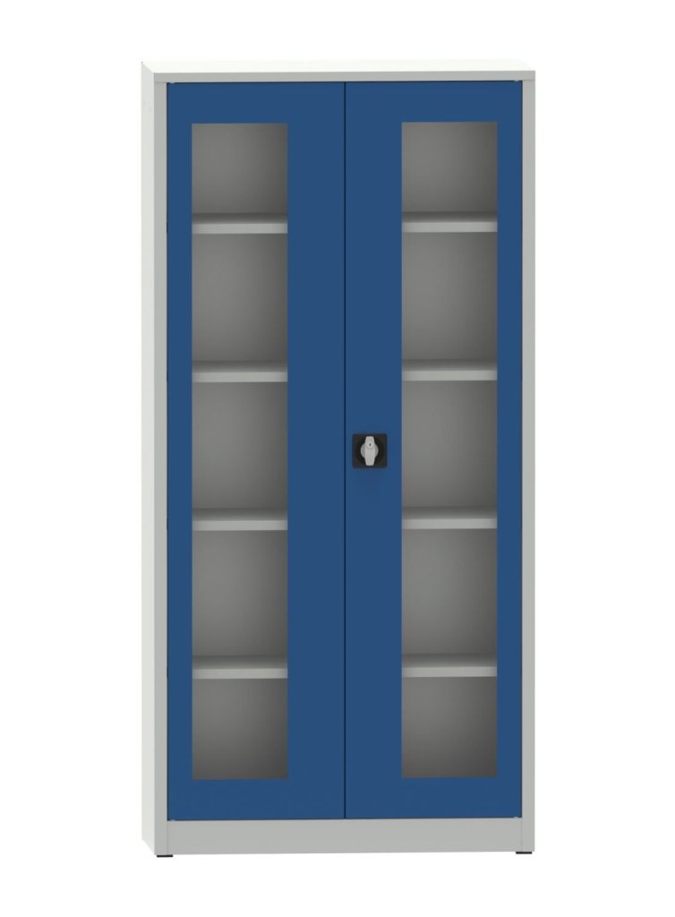 Dwudrzwiowa szafka na dokumenty. Wysokość 1150 x szerokość 950 x głębokość 400 mm, 2 półki. Blokada rozstawu osi. Kolor korpusu RAL 7035 jasnoszary. Dostarczany jest zdemontowany – łatwy montaż.