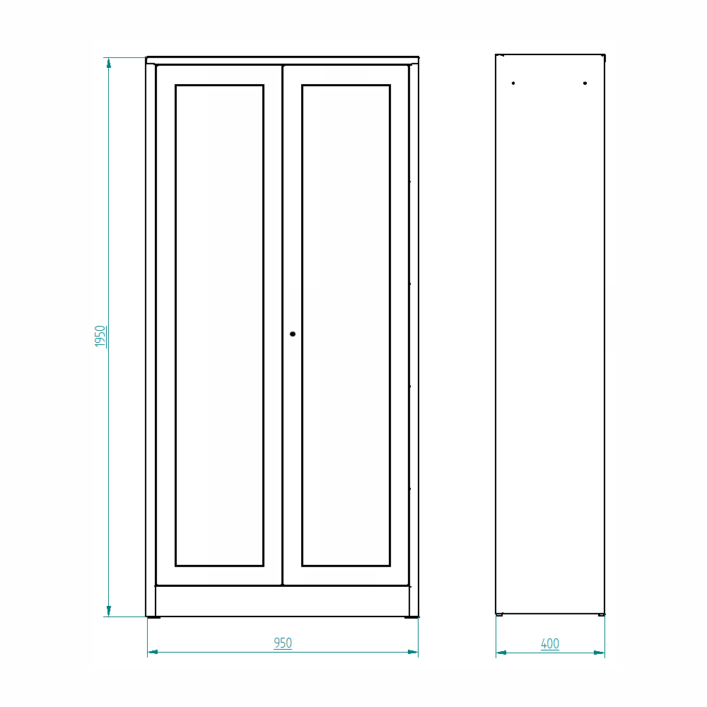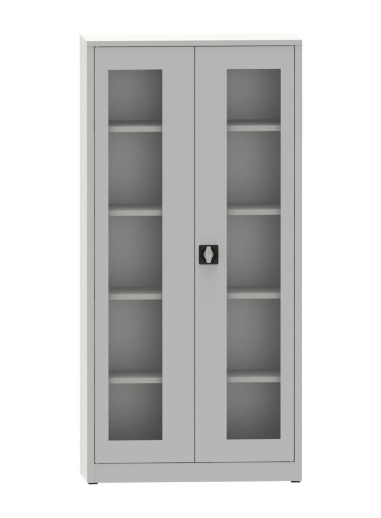 Dwudrzwiowa szafka na dokumenty. Wysokość 1950 x szerokość 950 x głębokość 400 mm, 4 półki. Blokada rozstawu osi. Kolor korpusu RAL 7035 jasnoszary. Dostarczany jest zdemontowany – łatwy montaż.