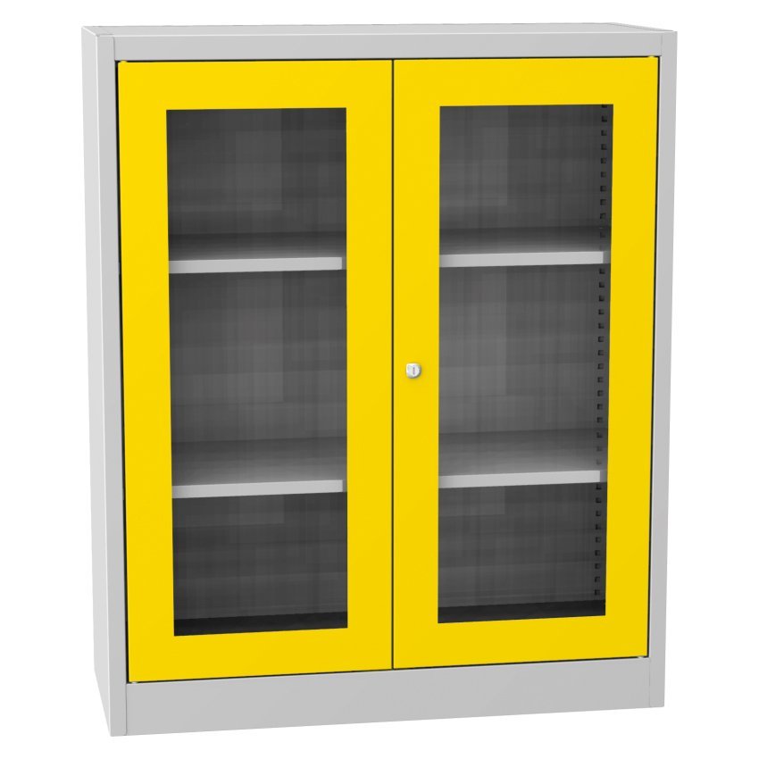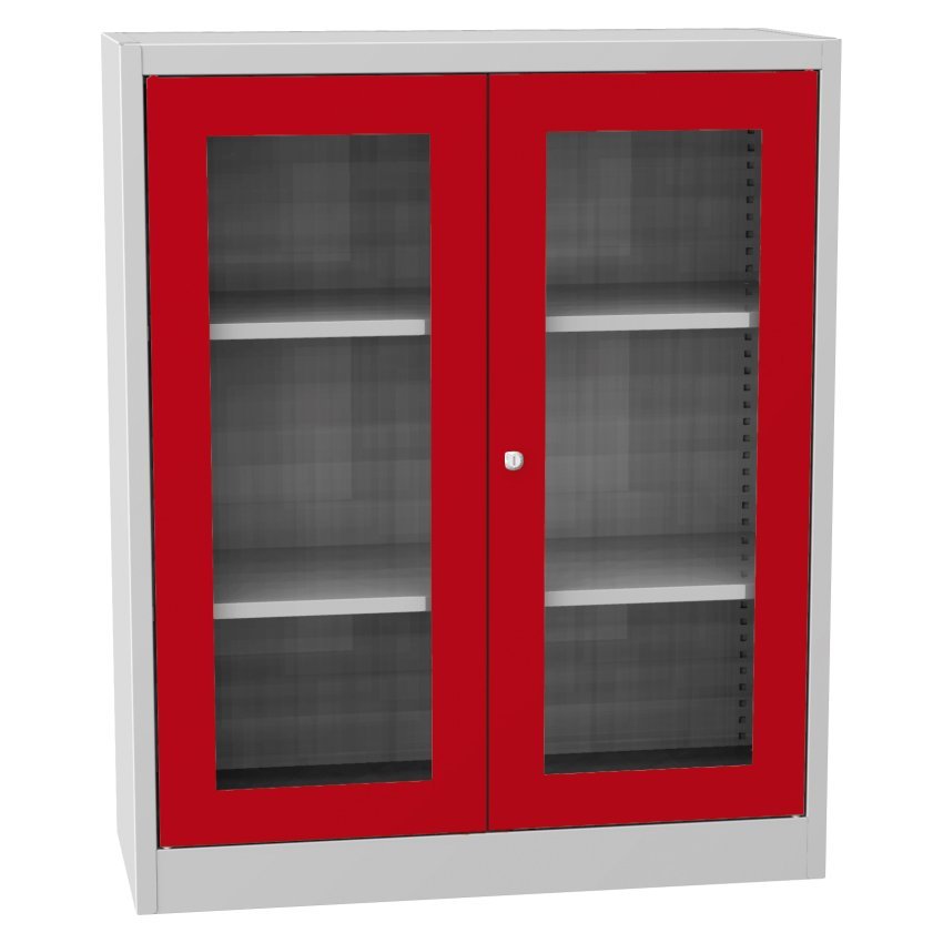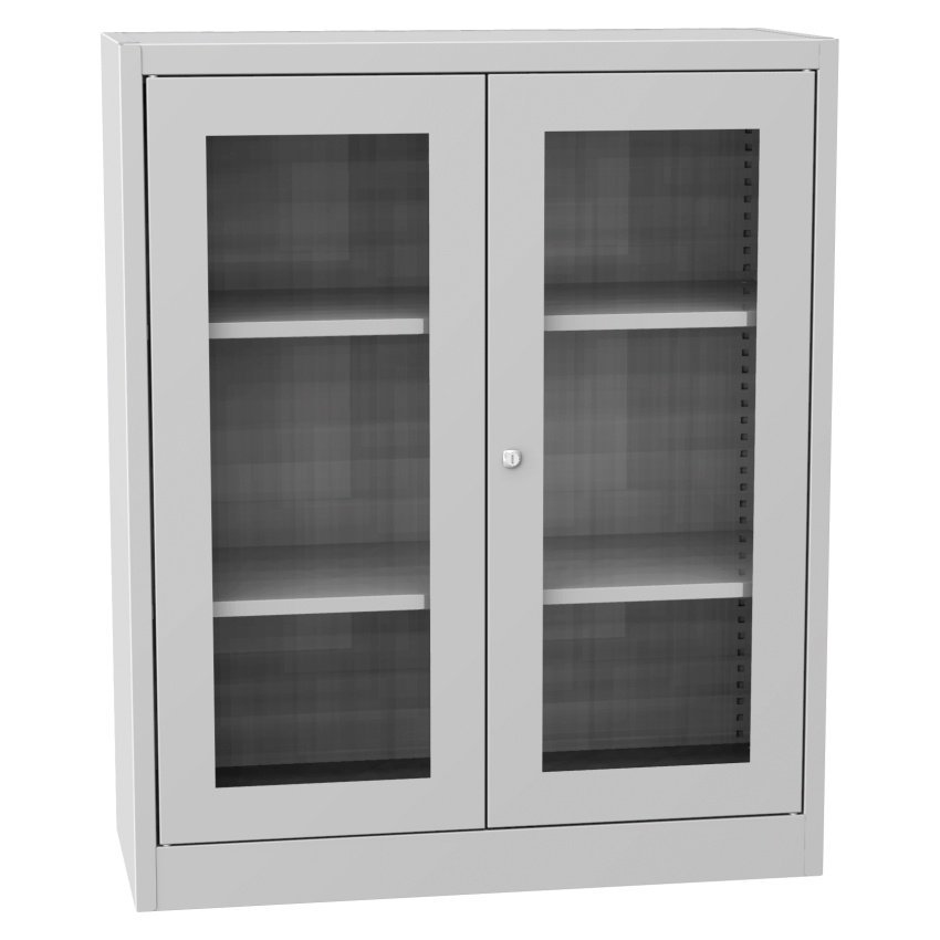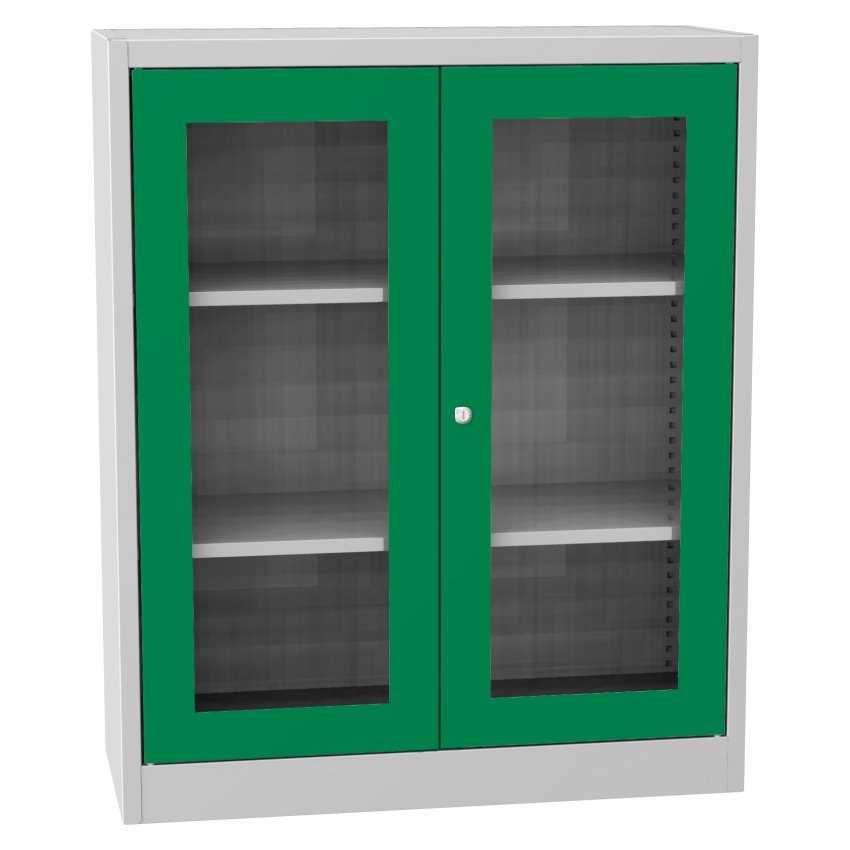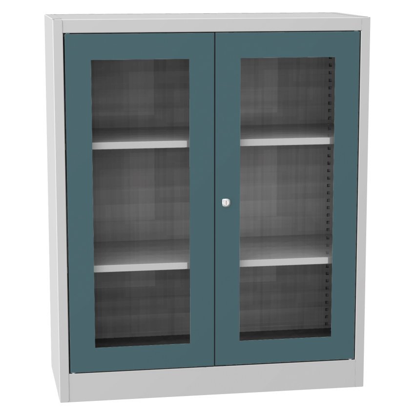 Dwudrzwiowa szafa na dokumenty ze szklanymi drzwiami i cokołem, szerokość 950, wysokość 1150, głębokość 400 mm, 2 półki. Możliwość wymiany drzwi z wypełnieniem szklanym na drzwi z wypełnieniem drucianym lub drzwi laminowane w odcieniu buku, brzozy lub wiśni. Kolor korpusu RAL 7035 jasnoszary.