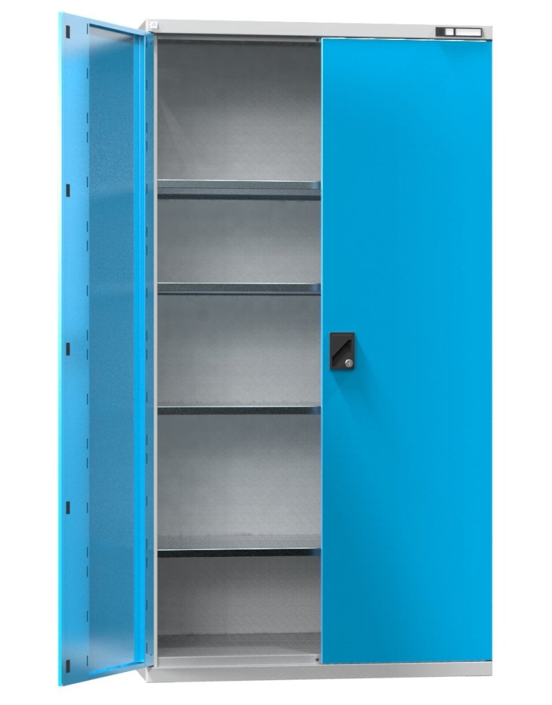 Szafa z drzwiami skrzydłowymi, 4 x półki regulowane w rastrze 25mm (ocynkowane), drzwi pełne ze wzmocnieniami pod perfo, nośność 600 kg. Wysokość 1950 x szerokość 1044 x głębokość 655 mm. Na stanie w kolorze nadwozia szarym RAL 7035 i drzwiach niebieskich RAL 5012.