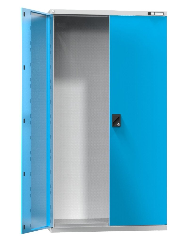 Szafa z drzwiami uchylnymi, drzwi pełne ze wzmocnieniami pod perfo, nośność 600 kg. Wysokość 1950 x szerokość 1044 x głębokość 405 mm.