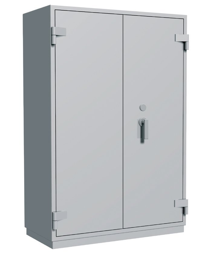 Szafa o podwyższonej odporności ogniowej, dwoje drzwi, 3 regulowane półki, zamykana na bezpieczny klucz. Wysokość 1560 x szerokość 950 x głębokość 550 mm, waga 350 kg, kolor jasnoszary RAL 7035.
