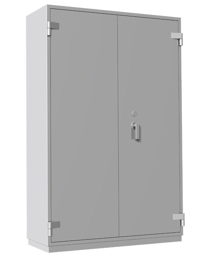 Szafa o podwyższonej odporności ogniowej, dwoje drzwi, 4 półki regulowane, zamykana na bezpieczny klucz. Wysokość 1950 x szerokość 1260 x głębokość 550 mm, waga 480 kg, kolor jasnoszary RAL 7035.
