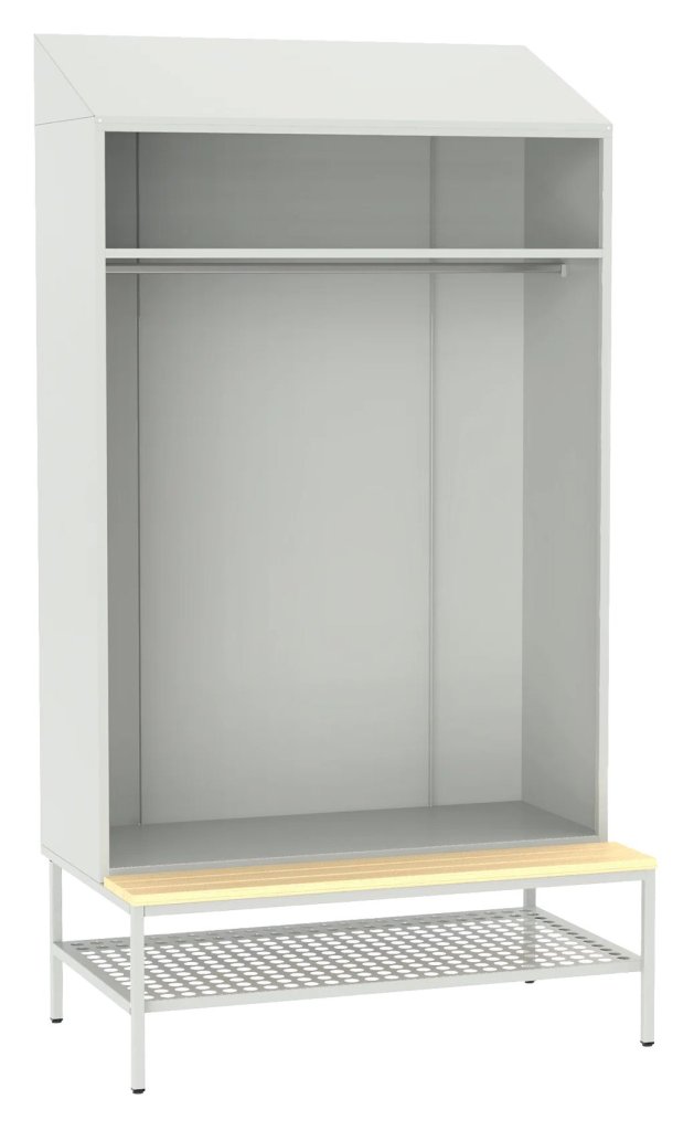 Szafa otwarta to praktyczne rozwiązanie do pomieszczeń wspólnych lub garderob, gdzie nie ma konieczności przechowywania ubrań w osobnych szafkach. Półki do przechowywania, drążek na wieszaki na ubrania, ławka drewniana, regał perforowany na buty. Do wyboru 16 odcieni kolorystycznych wliczonych w cenę bez dopłaty.