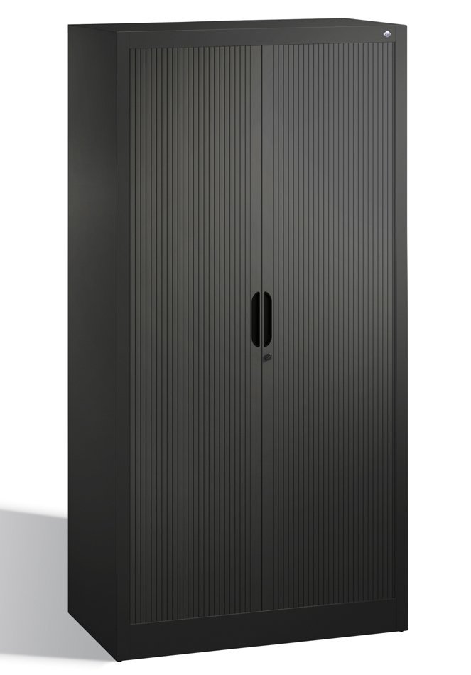 Szafka z walcowanego metalu z dwojgiem drzwi. Wysokość 1660, szerokość 800, głębokość 420 mm. 3 półki. Kolor korpusu i żaluzji jasnoszary RAL 7035/antracyt RAL 7021.