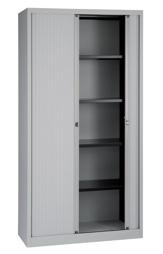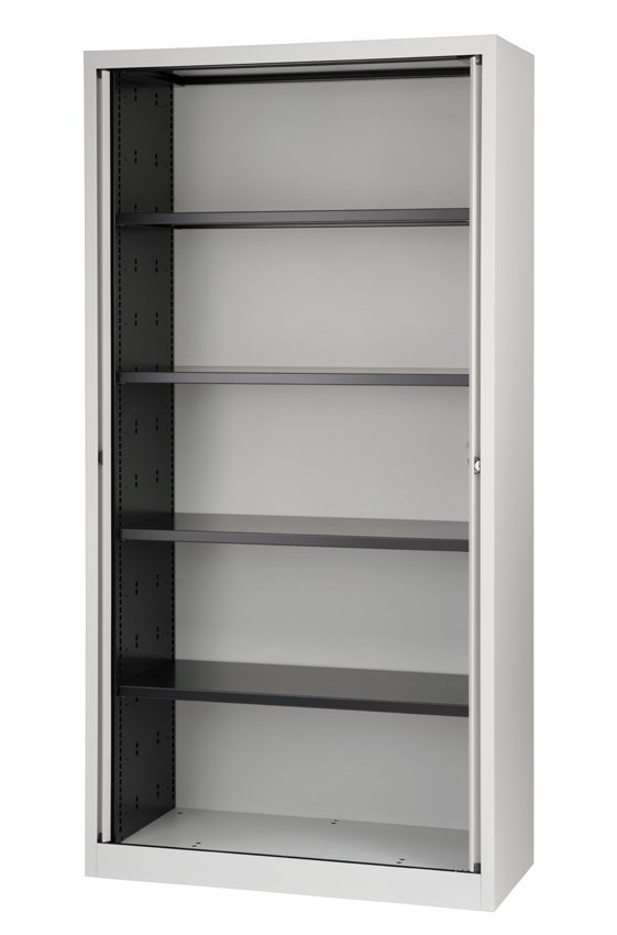 Szafa roletowa metalowa z roletami poziomymi z czterema półkami, szerokość 1000, wysokość 1980, głębokość 430 mm, różne kolory.