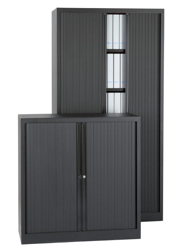 Szafka roletowa metalowa z roletą poziomą z dwiema półkami, szerokość 1000, wysokość 1181, głębokość 430 mm, różne kolory.
