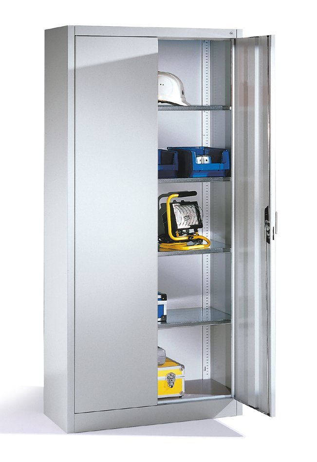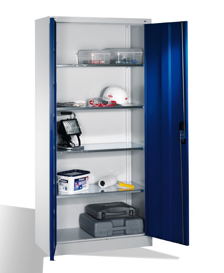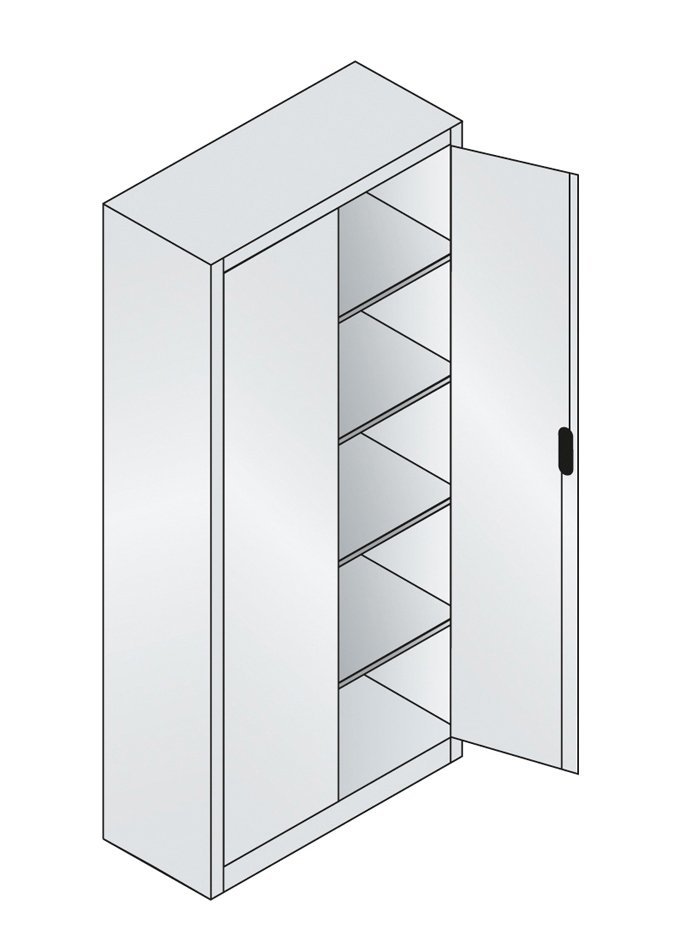 Szafa z drzwiami uchylnymi, 3 x półki regulowane w rastrze 25 mm (ocynkowane), drzwi pełne ze wzmocnieniami pod perfo, nośność 600 kg. Wysokość 1950 x szerokość 1044 x głębokość 405 mm.