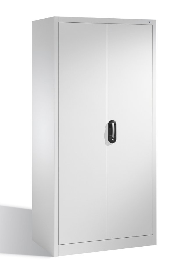 Szafa warsztatowa dwudrzwiowa, szerokość 950, wysokość 1950, głębokość 600 mm, 2 półki. Możliwość wymiany drzwi pełnych na drzwi z wypełnieniem szklanym lub drucianym. Kolor korpusu RAL 7035 jasnoszary.