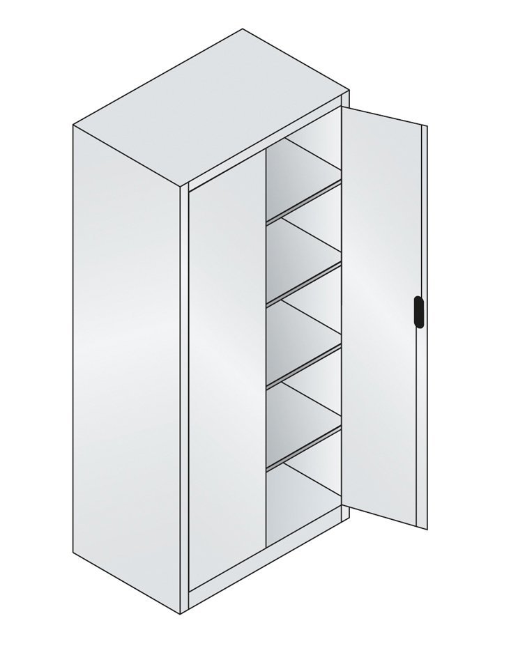 Szafa z drzwiami uchylnymi, 3 x półki regulowane w rastrze 25 mm (ocynkowane), drzwi pełne ze wzmocnieniami pod perfo, nośność 600 kg. Wysokość 1950 x szerokość 1044 x głębokość 405 mm.