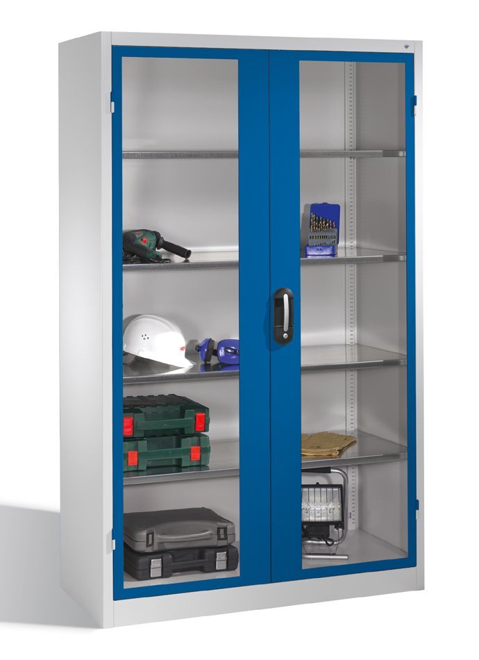 Szafa warsztatowa o trwałej konstrukcji stalowej i drzwiach stalowych z wypełnieniem ze szkła akrylowego. 4 regulowane półki pełny opis i parametry