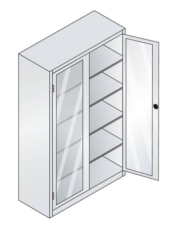 Szafka ze szklanymi drzwiami, wysokość 1150 x szerokość 505 x głębokość 400 mm. Ryglowanie na zamek bębenkowy z mechanizmem rozstawu osi. 2 x regulowane półki stalowe (nośność 60 kg). Drzwi szklane wykonane są ze szkła hartowanego. Możliwość wymiany drzwi z wypełnieniem szklanym na drzwi z wypełnieniem drucianym lub drzwi laminowane w odcieniu buku, brzozy lub wiśni. Kolor korpusu RAL 7035 jasnoszary.