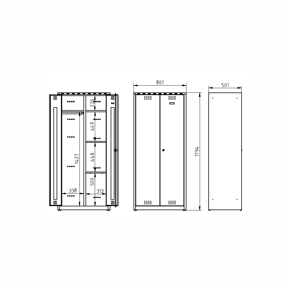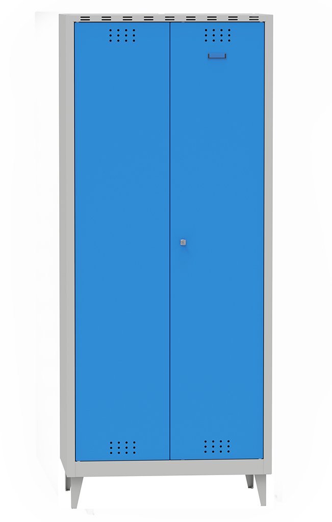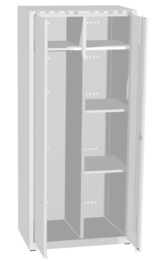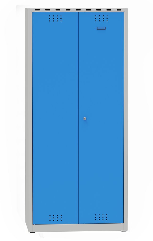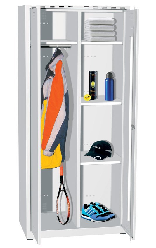 Duża szafka z podwójnymi drzwiami, wysokość 1800 x szerokość 600 x głębokość 500 mm. Szafka wyposażona jest w półkę, drążek na wieszaki z przesuwanymi haczykami. Kolor korpusu RAL 7035 jasnoszary. Zamek bębenkowy lub zamknięcie na kłódkę.