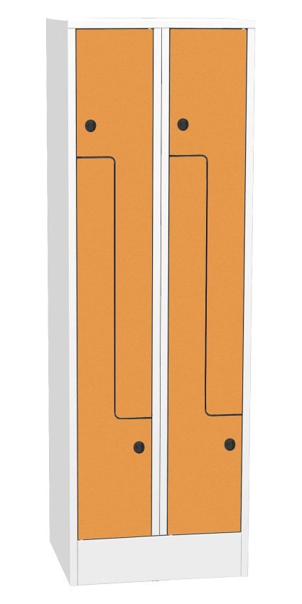 Szafka metalowa dwudrzwiowa dzielona, szerokość 400, wysokość 1850, głębokość 493 mm. Korpus metalowy w kolorze jasnoszarym RAL 7035, drzwi z laminatu HPL w kolorze niebieskim, jasnozielonym lub jasnopomarańczowym. Zamek bębenkowy z dwoma kluczami lub zamknięcie na kłódkę.