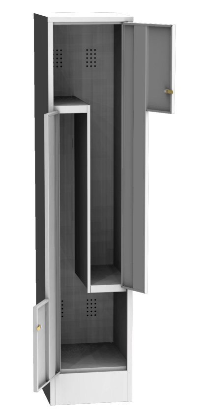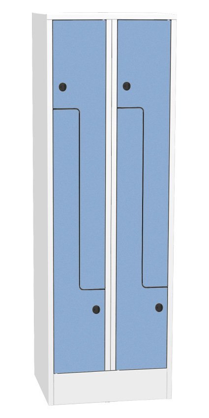 Szafa metalowa dwudrzwiowa dzielona, szerokość 300, wysokość 1850, głębokość 493 mm. Korpus metalowy w kolorze jasnoszarym RAL 7035, drzwi z laminatu HPL w kolorze niebieskim, jasnozielonym lub jasnopomarańczowym. Zamek bębenkowy z dwoma kluczami lub zamknięcie na kłódkę.