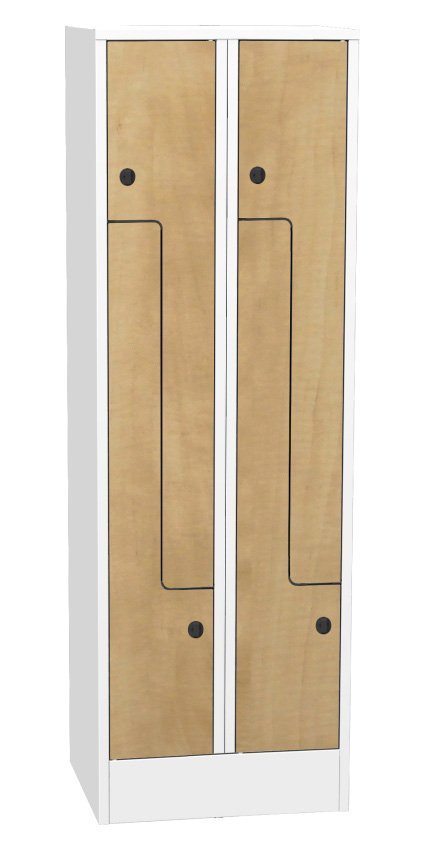 Szafa metalowa dwudrzwiowa dzielona, szerokość 300, wysokość 1850, głębokość 493 mm. Korpus metalowy w kolorze jasnoszarym RAL 7035, drzwi z laminatu HPL w kolorze niebieskim, jasnozielonym lub jasnopomarańczowym. Zamek bębenkowy z dwoma kluczami lub zamknięcie na kłódkę.