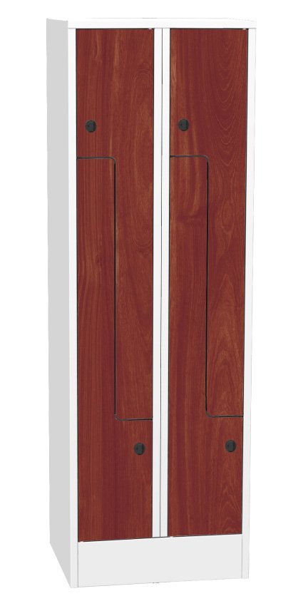 Szafa metalowa dwudrzwiowa dzielona, szerokość 400, wysokość 1850, głębokość 500 mm. Korpus metalowy w kolorze jasnoszarym RAL 7035, drzwi laminowane we wzorze buku, brzozy lub wiśni. Zamek bębenkowy z dwoma kluczami lub zamknięciem na kłódkę.