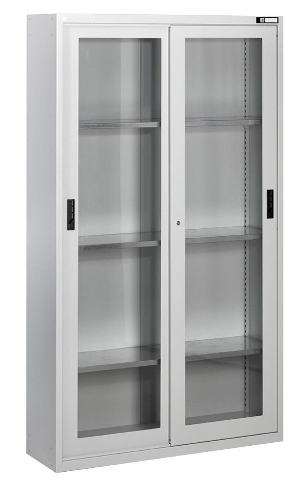 Szafa z drzwiami przesuwnymi, 3 x półki regulowane w rastrze 25 mm (ocynkowane), drzwi pełne, nośność 600 kg. Wysokość 1950 x szerokość 1044 x głębokość 405 mm, drzwi szklane w ramie stalowej.
