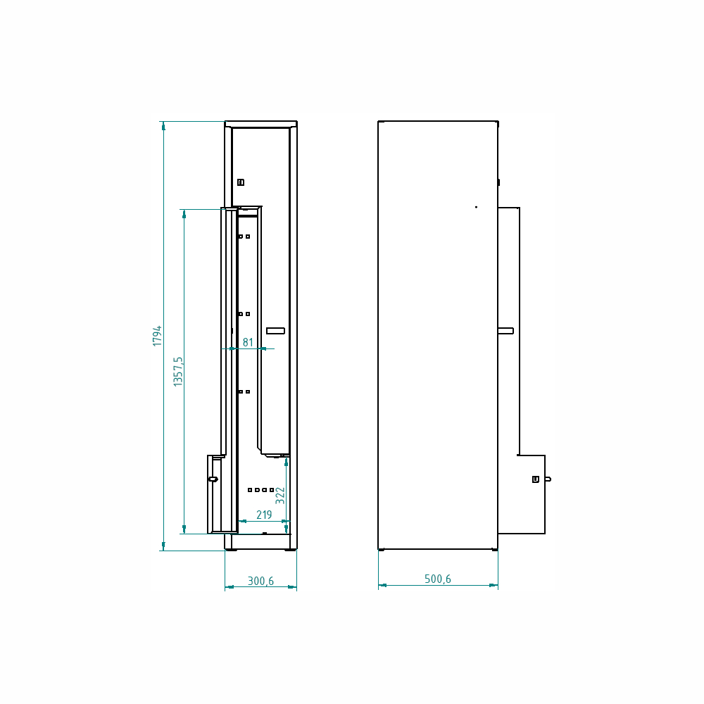 Szafa z drzwiami w kształcie litery Z. Wysokość 1800 x szerokość 300 x głębokość 500 mm, 2 przegródki, na cokole lub na nogach. pełny opis i parametry