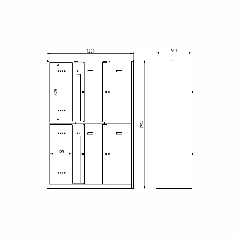 Szafa metalowa z zamykanymi schowkami, wysokość 1800 x szerokość 800 x głębokość 500 mm. Zamknięcie na klucz lub kłódkę. Kolor korpusu RAL 7035 jasnoszary.